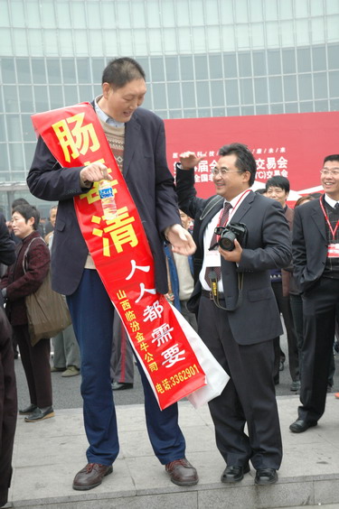 魏大华董事长总经理在潘高寿展位前接受重庆电视台采访
