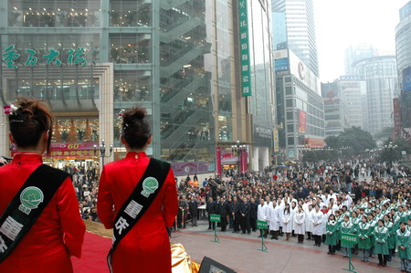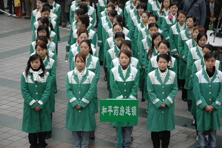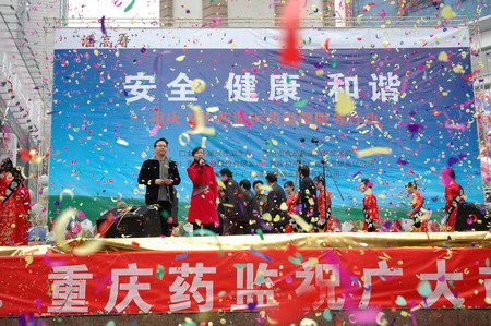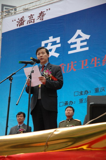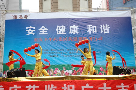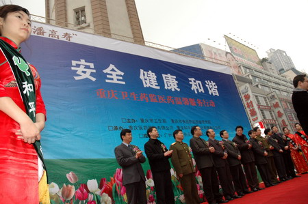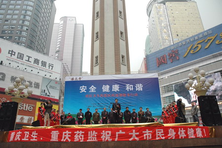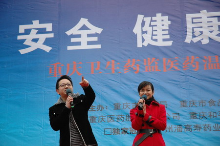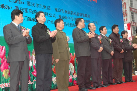 当日上午10:00嘹亮的军乐《歌颂祖国》拉开活动序幕。接着,和平医药股份有限公司党委书记、副董事长庞世荣和潘高寿副总经理冯耀文先后发言。工商联手同唱“为民、便民”曲。和平药房是一家有着60多年历史的“全国用户满意服务企业”,坚持以“小病当医生,大病当参谋,重病当亲人”为宗旨,努力服务社群。而以“百年治咳,真材实料,良药济世”为己任的潘高寿当仁不让。“为重庆市民送上最好的止咳药、放心药、健康药……”冯耀文副总经理激动地向现场的数千名群众说。随后,重庆市药监局局长夏永鹏、市卫生局长屈谦、市张副秘书长分别讲话,表示各司其职、各尽其责,为医药经济发展保驾护航;为人民安全用药、科学用药、用便价药竭诚服务……