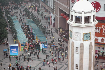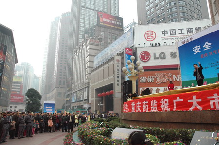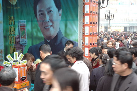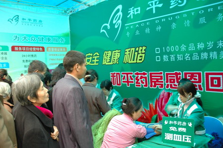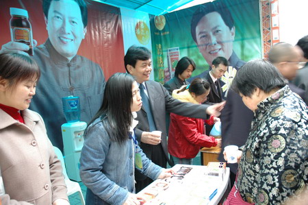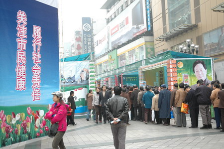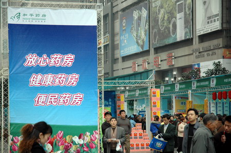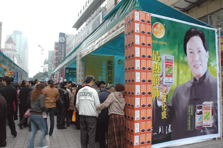 开幕式之后,数千市民涌向设在步行街中心广场上的药监、卫生、药企、医院等部门所设的上百个服务点和展位求医问药、量血压、看眼疾等各式其适,市民不亦乐乎。“潘高寿”、“中药一厂”、“三九集团”、“同仁堂”等知名大品牌企业,顾客特别多。耳闻目睹,市民对“广药”并不陌生,潘高寿的蛇膏、蜜膏,中一的消渴丸……不少市民交口称赞。在潘高寿的展台前排起长龙,咨询治咳药知识、买药(由OTC代表到附近药房代买)拿奖品。看来“北有同仁堂,南有潘高寿”此实不虚。不知是因为挟“广药会”(在重庆刚闭幕)之雄风所致,或是广药实在是有基础。在此市民热捧,对“广药”反应热烈。可见,“广药”走向全国,大有希望。
