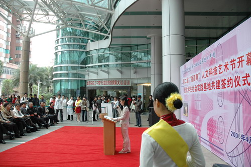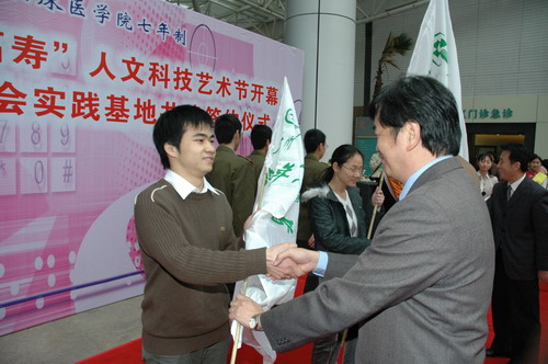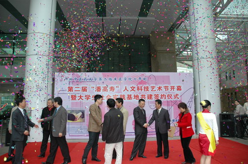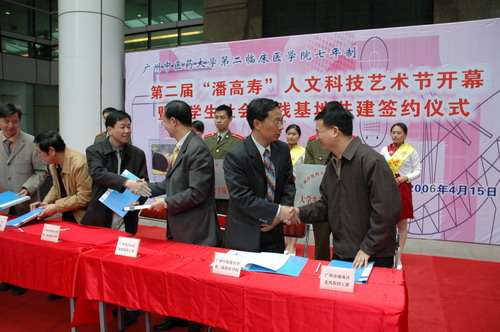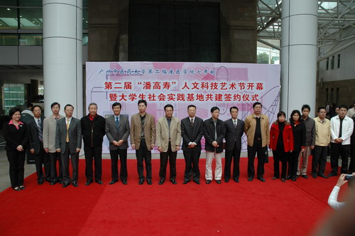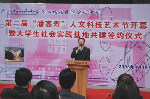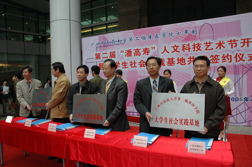 4月15日上午,第二届“潘高寿”人文科技艺术节在广东省中医院拉开帷幕。同时,第二届临床医药学院领导与越秀、天河、白云等六个区、街道领导分别签订了大学生社会实践基地共建签约仪式,并进行了实践基地授牌。