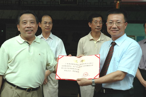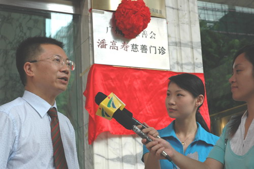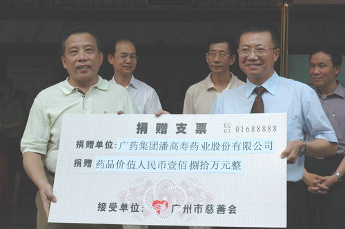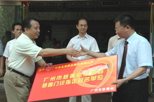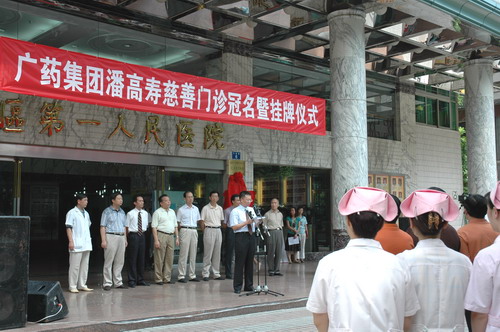 仪式上,市政协副主席郭锡龄向潘高寿颁发了“广州市慈善会潘高寿慈善门诊指定冠名企业”牌匾。是对该企业的肯定,这次潘高寿向慈善会捐赠了价值180万元的药品,用于广州慈善门诊。这是特困病患者的福音。从1995年11月广州成立首家慈善门诊——市东升医院