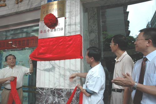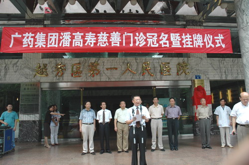 昨天(7月6日),广州市慈善会,广州潘高寿药业股份有限公司在越秀区第一人民医院前广场举行了“广州市慈善会潘高寿慈善门诊”冠名暨挂牌仪式。广东省慈善总会、广州市民政局、广州市慈善会、越秀区政府、越秀区卫生局、潘高寿药业等单位近百人出席。市政府副秘书长周亚伟、越秀区第一人民医院院长陈兆义、广州药业董事、副总经理何舒华、潘高寿药业董事长、总经理魏大华分别致辞。接着,市政协副主席郭锡龄、市政府副秘书长周亚伟、越秀区第一人民医院院长陈兆义、潘高寿董事长魏大华,齐齐为“广州市慈善会潘高寿慈善会门诊”牌匾揭幕。标志着广州17家“潘高寿慈善门诊”同时启动。众多市民驻足,见证善举,拍手称快。