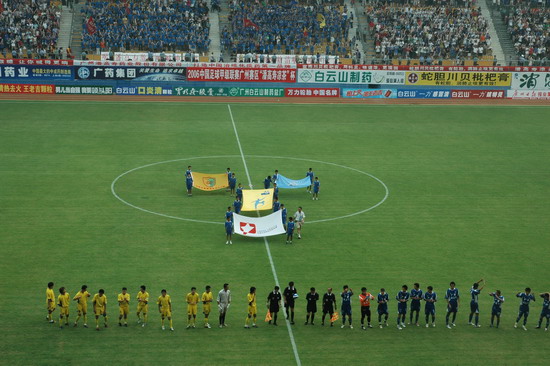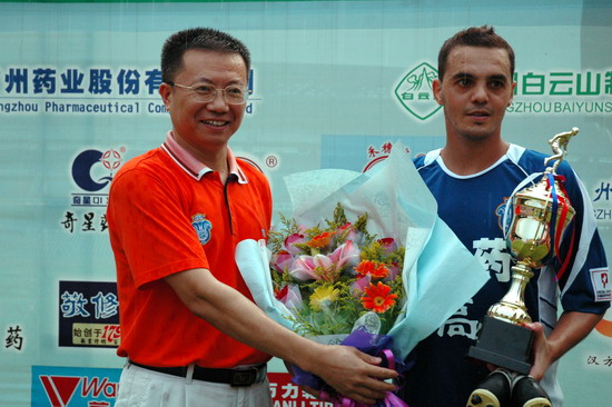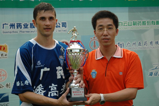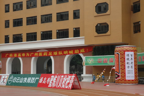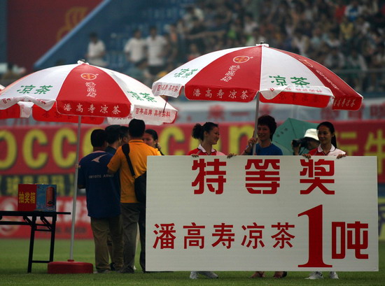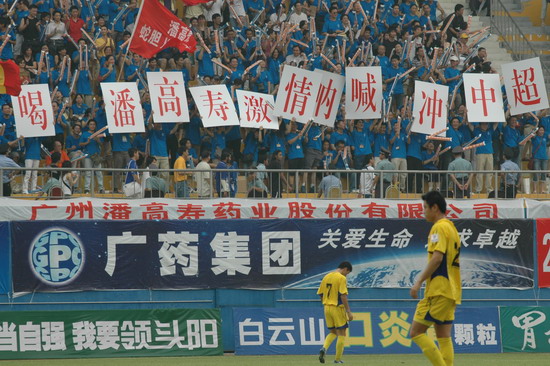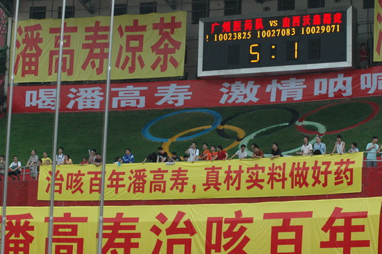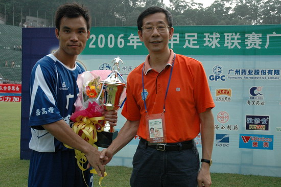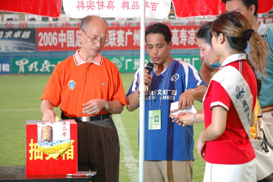 这一场的胜利当然得益于天时、地利、人和。此役,由潘高寿倾力承办,推波助澜,有声有色。上千员工助阵,燃点万丈的激情,众球迷千呼万应,鼓声、呐喊声自始至终不绝于耳。球赛中休,由广东电视台著名主持人谢亮主持潘高寿幸运大抽奖,公司魏大华董事长总经理、刘润发党委书记以及澳大利亚新资源投资集团蔡总裁分别抽奖。最牵动人心是双重惊喜——泰国游双程机票(一等奖);一吨潘高寿凉茶(特等奖)。下半场,已三球在手的广药队攻防有点乱,脚法也走样。“广药队的老问题‘未解决’”在边场拍摄的足球报摄影部主任梁嘉建与笔者谈起足球经。也难怪事后广州日报称这是一场技术含量不高的比赛,就连主教练戚务生也开心不起来,叹谓“比分不能说明问题,客场才是关键”。的确,现在还不是祝捷的时候,目前“广药”在中甲仍是“老三”。不过好戏在后头,广药集团下属企业特别是潘高寿人情怀不变,期待广药冲超梦园的那一天。赛后,广药集团副总经理谢彬为荣获最佳球队广药队颁发了“潘高寿凉茶”杯;广州药业总经理施少斌为卡拉乌迪颁发了“最佳射手”奖;潘高寿魏大华董事长总经理向舒马赫颁发了“最佳球员”奖。
