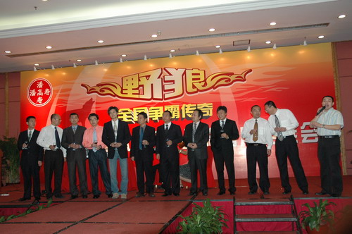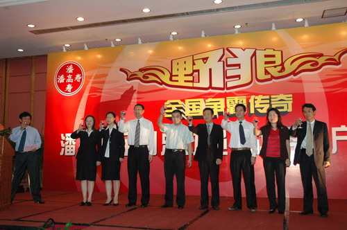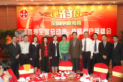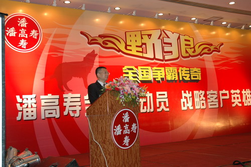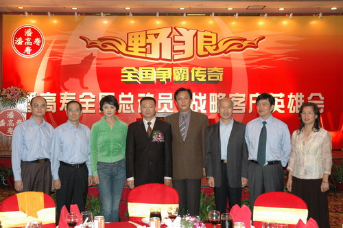 “狼窝”,不,这是个以“野狼”名义的潘高寿营销团队。只见:野狼点将——海狼、天狼、傲狼、剑狼……;八部受命——销售一、二部、新药、媒介、食品、国际……。精兵强将,整装待发。“狼中王”——潘高寿公司董事长兼总经理魏大华运筹帷幄,众将领行兵布阵。魏总回顾了两年来向全国策动的营销“野狼行动”的成果以及实施品牌战略所取得的成绩。“潘高寿”作为中华老字号成功转型,已从区域的品牌走向全国的品牌,在不久前公布的“中华老字号”价值排行榜上,潘高寿名列28,在广东排名第2。我们要乘胜前进,“三亮剑”(蛇膏、蜜膏、蛇液)。明确重实效、精细化的指导思想,夯实基础,再筑层楼,进一步拓宽市场。为此,营销中心营销总监王彤指出,将强化和完善销售渠道及价格体系,创造一个良性的市场竞争环境,建立起经销商的专家网络,使渠道更加通畅和高效。对经销商的市场支持还体现在强大的广告传播方面。媒介部经理戴梅表示,在来年的媒介投放上将更系统、合理、科学和实效。力求投入产出的最大化,追求广告有效的到达率,扩大受众人群。以区域市场为主,以终端先行、媒体跟进,进行整合的传播,已联手国内的著名媒介代理公司为顾问。会上,潘高寿正式与广州传立媒体公司签约。随即,该公司媒介总监何英作了止咳药市场的分析报告。犹如市场的望远镜,让我们看得更真、更清,看到新的希望,还因为潘高寿不是孤军奋战。重庆电视台、海马广告有限公司等媒体和市药材公司、市医药公司等经销商的领导在会上先后发言,尽表关爱与支持,客户的信心更足了。同时,魏总郑重宣告设立100万元的总经理专用基金,特奖对市场作出显著成绩的客户,成为大会的亮点。而另一亮点,当是潘高寿的重量级产品代言人唐国强和刘蓓与潘高寿的签约。唐国强说续约是基于对潘高寿这个中华老字号的认同,产品的确好。“主席”的眼光就是不一样。