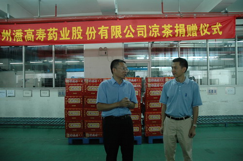 8月9日下午,一场大雨给炎热难耐的羊城迅速降温。潘高寿药业股份有限公司总经理魏大华代表公司来到羊城晚报发行部慰问送报员一线员工,向他们送上潘高寿凉茶一批。