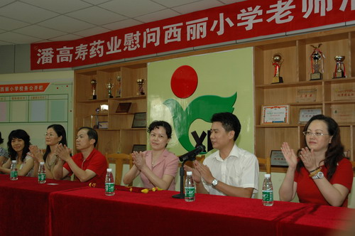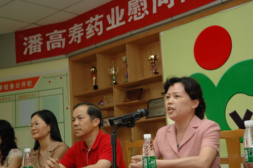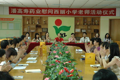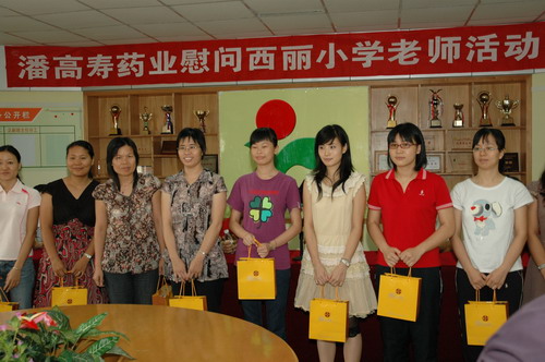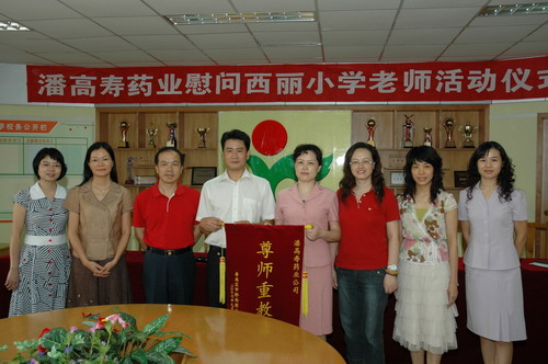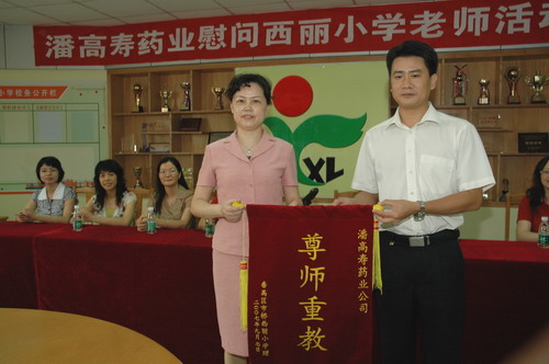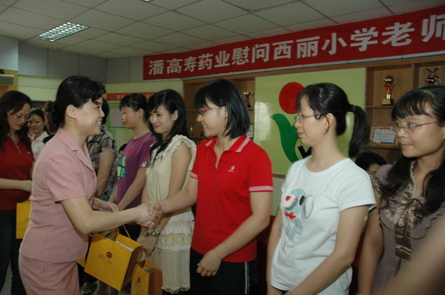 郑书记一行受到番禺市桥城区教育指导中心刘主任、陈主任及西丽小学三位校长以及教师们的欢迎,郑书记关切地询问西丽小学的教学工作、生活情况。她说,人民教师是光荣而伟大的职业,她们像蜡烛一样燃烧着自己却照亮了别人。每个人都要经历在教师的栽培教育下成长的阶段。教育的发展和进步,离不开园丁们的勤奋耕耘。她勉励老师们进一步增强光荣感、责任感和使命感,不断树立新的教学理念,创新教学方法,提高教学质量,在教育岗位上团结向上、勤勤恳恳地工作,为番禺区的教育事业再立新功。潘高寿是117年的中华老字号,在企业发展同时,一直不忘感恩社会、回报社会。因长期讲课且广州近期连续出现闷热“桑拿”天气,教师们都患有不同程度的呼吸道感染或咽喉炎。川贝枇杷膏和川贝润喉糖是我司的主打产品,是我们对园丁们献上的一份爱心,希望能缓解他们的不适症状和保护咽喉嗓子,讲好每一堂课。刘主任和许校长感谢潘高寿对教育事业的重视、关心和支持。他们表示十年树木,百年树人。教育要出成果,必须下很大的决心,进行坚持不懈的努力,希望教师们努力工作,再接再励,为番禺区的教育事业作出积极贡献。同时也希望全社会都来关心、支持教师的工作,让尊师重教成为一种良好的社会风气。并祝愿潘高寿做大做强。