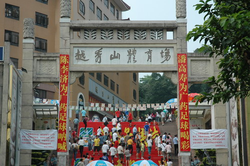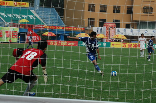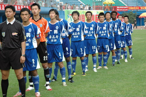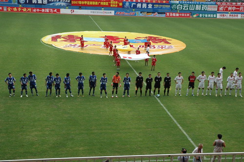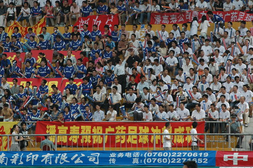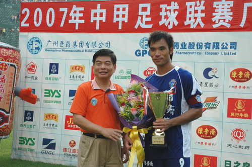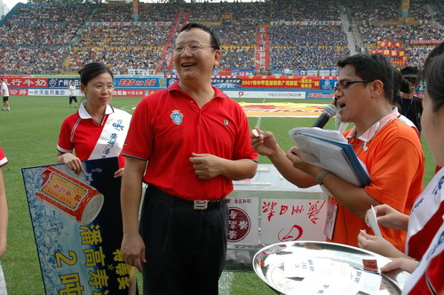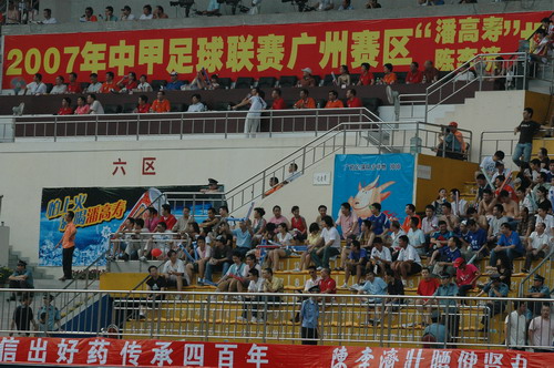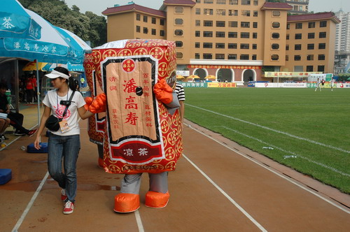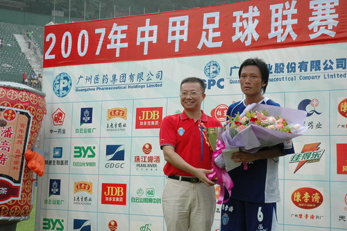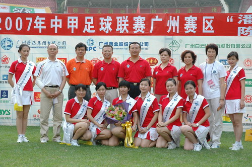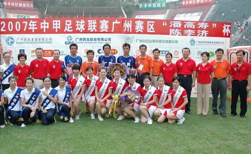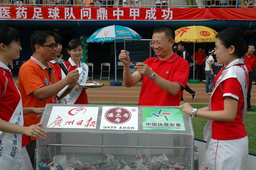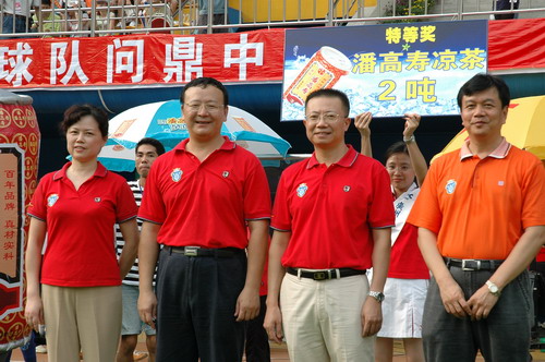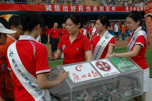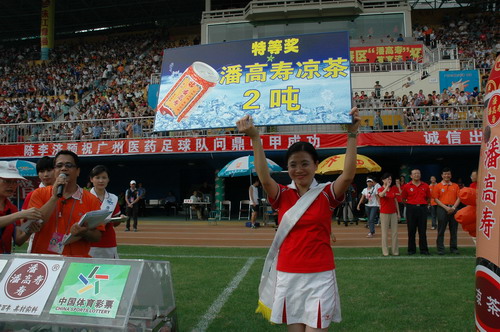 这场球赛,非常之热——天气闷热,球迷火热。只见主席台对面潘高寿啦啦队的白色方阵与相邻的球迷大联盟的蓝色方阵相呼应,鼓掌击棒、摇旗呐喊,不绝于耳,声势浩大。球赛由与广州足球颇有渊源的潘高寿和陈李济两家老字号冠名(当年两企业参与“市长杯”、“血宝杯”等等足球赛事),怪不得策划活动如此有声有色。又见中山纪念碑下的看台上,以及计分牌下“喝潘高寿的凉茶”的海报十分醒目,似乎给大家带来清爽的痛快感。就在球赛中休时,潘高寿举行“幸运大抽奖”,分别由潘高寿公司苏广丰董事长、魏大华总经理、郑楠党委书记抽奖。其中特等奖为重达2吨的潘高寿凉茶。球迷的热情,企业的支持是广药队力量的源泉——上个月,潘高寿还专程到广药队在白云山麓训练基地,慰问在酷暑中坚持训练的广药队众将士,送上的也是这清润的凉茶。所谓功夫不负有心人,赛后,广药队荣获最佳球队,广药集团杨荣明董事长向球队颁授了“潘高寿 • 陈李济”杯。黄志毅被评为“全场最佳球员”。“最佳射手”由徐亮获得。