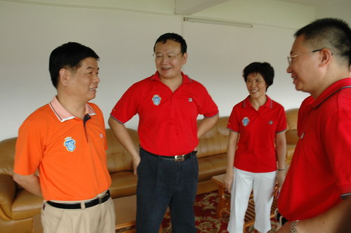 广药集团董事长杨荣明(左一)与潘高寿董事长苏广丰(左二)、潘高寿总经理魏大华(右)交谈,勉励潘高寿再上层楼