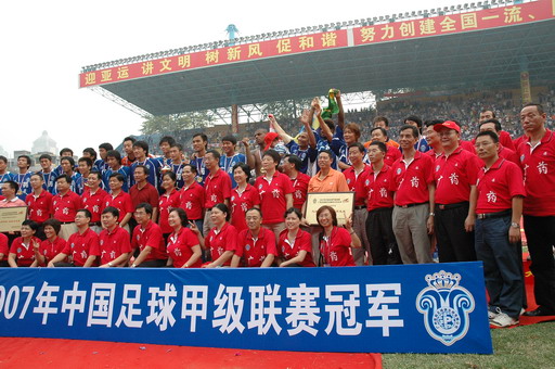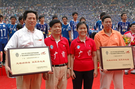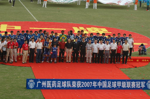 广州市体育局局长刘江南、广药集团董事长杨荣明先后作了热情洋溢的致辞,衷心地感谢了对广州队不离不弃的广州球迷。接着,中国足协联赛部官员朱琪琳宣布了广药队成为2007年中甲联赛的冠军获得者。最激动人心的一刻终于到来,中国足协联赛部主任马成荃亲手把中甲联赛冠军奖杯送到了广药队队长李志海手中。沈祥福获“最佳教练”,徐亮获“最佳球员”,拉米雷斯获“最佳射手”,“优秀球员”由卢琳、李帅、拉米雷斯获得。刹那间,整个体育场弥漫着彩烟、礼花、喷雾、彩带和气球,响起了雄壮的《我们是冠军》的歌声,全场球迷一起呐喊,这是让每一个广州人都热血沸腾的时刻!