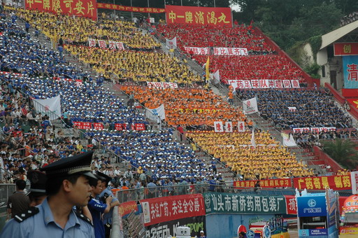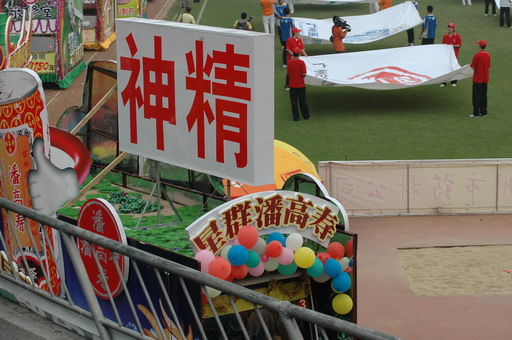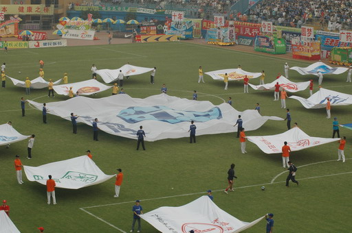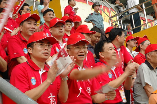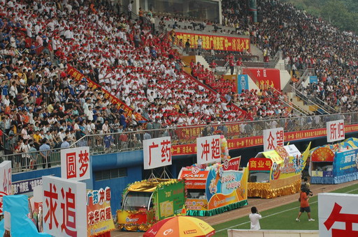 12时30分,垫场赛正式开始,对阵双方是广药二队和获得去年广东省业余比赛冠军的机安队。老广州队员孔国安、古广明在场上的一招一式都博得球迷们的满堂喝彩。只见记分牌两侧集团下属企业的各色方阵互相呼应,星群、潘高寿的红色方阵鼓掌击棒,摇旗呐喊,声势浩大:“星群、潘高寿,冲超占鳌头!”为广药队喝彩之声不绝于耳;“星群、潘高寿,十亿共携手!”高喊着两家企业资源整合的好势头!