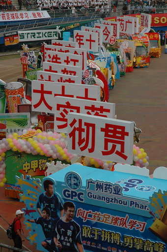 为庆祝广药队冲超成功,集团与俱乐部精心策划了一场简约而热烈的庆典。中场休息的15分钟,庆典的上半段正式开始。球场中央铺起了大大的广药标志和下属26家企业的旗帜,这是一个感谢的时刻,球迷们欢呼一片,感谢企业为支持广药队冲超,两年来一直在背后默默给予强大的支持。紧接着,18辆造型精美的花车缓缓地绕场一周。星群与潘高寿的花车在当中显得格外耀眼,两家企业发挥资源整合的优势,花车上两家企业的产品“携手共进”,尽显“兄弟本色”。