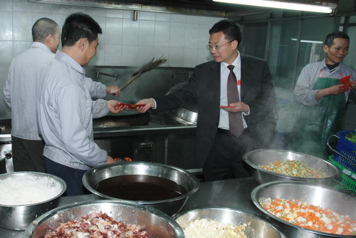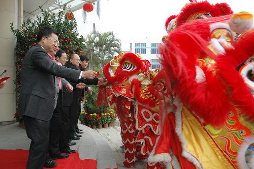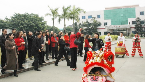 思想得解放,精神更抖擞。只见,星群各部员工代表、星群、潘高寿营销中心全体员工齐集办公楼前。苏广丰董事长、郑楠书记、魏大华总经理、许招懂副总经理、胡燕副总经理、冯耀文副总经理、姚江雄经理、梁志平书记、刘广穗主席、黄伯强主席众领导齐齐出席醒狮贺岁开工仪式。9:18分,苏广丰董事长祝全体员工新年快乐,并激情宣布:正式开工!今天是个好日子,今年是星群潘高寿的好年,祝大家身体健康、财源广进!接着进行了猛狮采青表演。随后,众领导又赶往番禺潘高寿厂区主礼,开工仪式一样热热闹闹、喜气洋洋。仪式后,苏董、郑书记、魏总、梁书记、姚经理等领导一同到饭堂、锅炉组、仓库区向工人派利是……