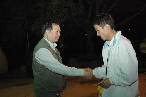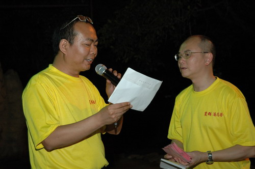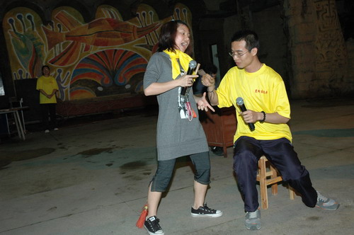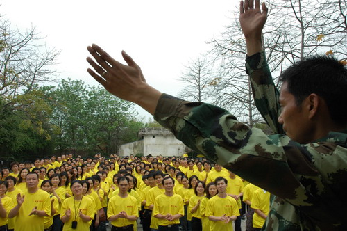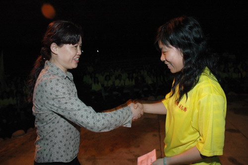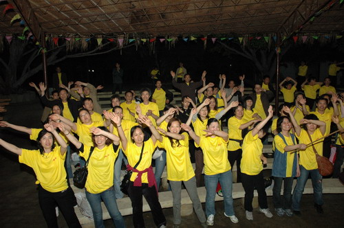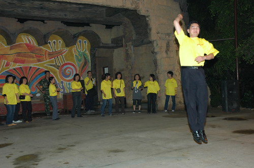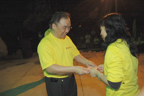 晚上7:30,一场队员自编自导自演的联欢晚会正式开始。晚会前公司党委书记郑楠讲话: “一人走百步不难,百人走一步却很难”。希望大家将我们培训中学到的、悟到的东西带回到我们的工作和团队当中去,齐心协力团结在公司领导的周围,将1+1工程做好。要注意保鲜,要长久地保持旺盛的活力,不断反思、总结工作中的经验,营造宽松、充满活力的氛围。9个分队轮流上演了包括朗诵、合唱、独唱、舞蹈、小品、三句半等17个多种形式的精彩节目。一首《无厘头,争上游》的诗朗诵配唱,道出了星群潘高寿人在资源整合的局势当前团结一心,力争上游,排千难、除万险的信心和决心;大合唱《当你快乐你就拍拍手》表达了星群潘高寿人尽享资源整合带来的喜悦和1+1>2的成果;小品《办公室的故事》描绘了星群潘高寿产品市场一片大好的美好前景;诗朗诵《向前看》表明了星群潘高寿人将与时俱进,携手共赴美好前程……. 欢乐的歌谣、狂热的舞步、婀娜的身姿、搞笑的动作使整场晚会气氛热烈、高潮不断、佳作迭出。大家沉浸在欢乐的黄色海洋里。最后,经过考评小组一天的严格考评,综合各队的团队精神、协调能力、执行能力、创新能力等多方面分数,综合考评组、教官组和各分队互评的分数,第九队(欢乐长久队)获得团队第一名,第八队(棒棒队)获得团队第二名,第九队队长获“优秀队长”,第八队队长获“最佳队长”,伍一杰、周达荣等9名表现突出的队员获“铁杆队员”。
