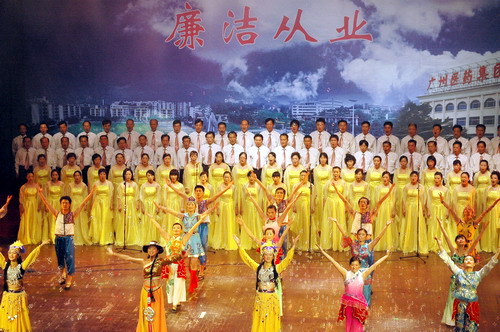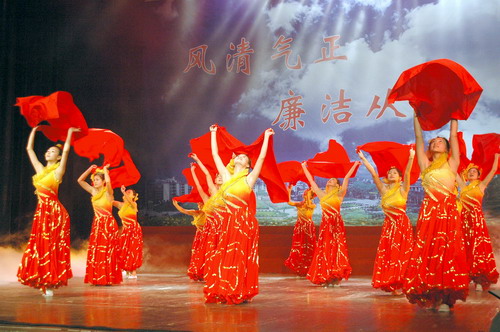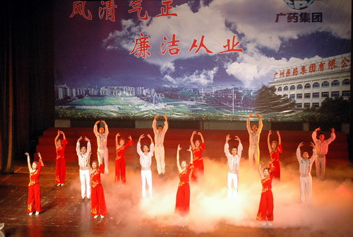 这是一台企业廉洁文化的汇演。各企业精选好戏,12个节目(舞蹈、小品、快板、合唱等)各自各精彩。我司的音乐舞蹈剧《代价》以及与“星群”合演的舞蹈《红旗颂》,形神兼备,颇为感人。观众看得入神,在独特文化艺术的熏陶下,思想端正,灵魂净化。可见,这台文艺汇演也是一台企业强化文化廉政建设与反腐倡廉的一次检阅。今年以来,贯彻广药集团关于廉政文化建设与纪律教育月活动的指示,我司大力推进廉政文化建设进企业、进班组活动,通过多种形式宣传教育,使廉洁理念深入人心,精神风貌焕然一新。