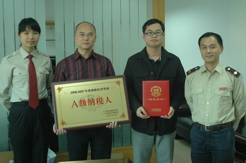 11月25日,广州市国家税务局、广州市地方税务局联合在番禺进行了2006—2007年度纳税信用等级A级纳税先进单位颁奖。我司荣获“A级纳税人”牌匾。这是继2004—2005年度之后,我司再次获此称号。