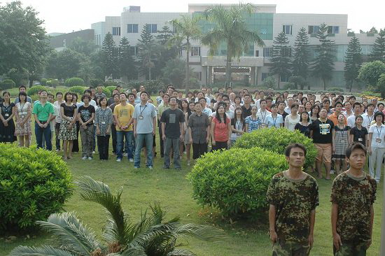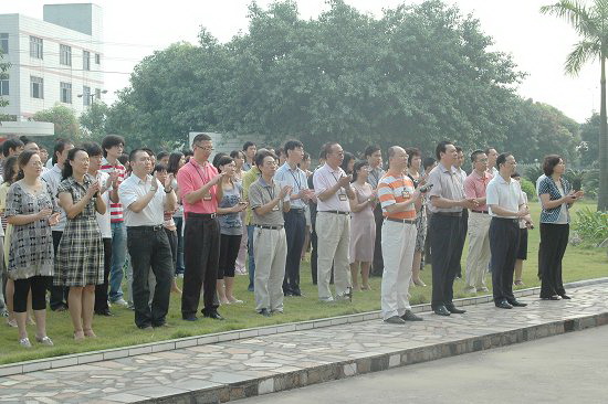 员工们凝视国旗,目光一致;齐唱国歌,力量倍增。