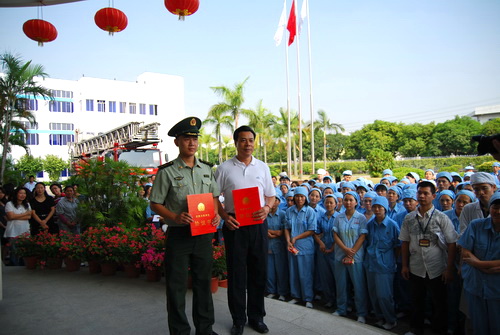 演练结束后,公司还组织了所有参加演练人员,由区消防官兵进行消防知识现场培训,针对各器材的使用特点进行讲解传授,结合现场操作提高全员消防意识。最后我司还与区消防中队现场签署了《双拥共建单位协议书》,加强对公司辖区消防环境的和谐管理。