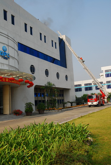 警情就是命令!公司立即启动应急救援预案,公司义务消防队立即赶赴现场进行自救。张伟祥副总经理亲临现场指挥,综合楼所有人员在保安部麦学良指挥下马上组织有秩序的疏散和撤离。仅过了5分钟,区消防中队的三台消防车到达我司,在安全保卫部陈伟强的引领下迅速来到现场立即展开灌救灭火,云梯车快速将云梯伸展至20多米高的综合楼顶层,对“被困”在楼顶的员工分批实施救援、医疗救护组也派出担架队对“受伤”的员工“抢离”危险区域……一场“意外”的“火灾事故”在短短的20分钟就被扑灭。