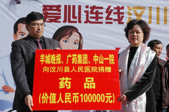广药集团潘高寿药业公司党委书记郑楠介绍,此次广药集团共为当地捐赠共达10万元的药品,第一批药品包括潘高寿蜜炼川贝枇杷膏、治咳川贝枇杷露,白云山和黄口炎清、板蓝根等常备药品已随爱心团一起送抵汶川人民医院。第二批由广药集团公司属下企业捐助的药品也将于近日送抵。郑书记表示,希望通过“健康万里行———爱心连线汶川,与盛会共起舞”的活动,在为当地医疗资源配置工作出一份力的同时,也进一步加强广州医药界和汶川医疗卫生系统的联系,建立双向合作关系,为汶川的卫生事业贡献更多的力量。