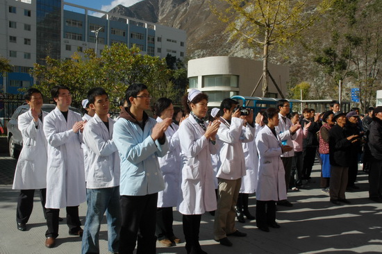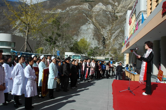 爱心团来到由广州市定点援建的汶川县人民医院,这是一所投资近两亿,高度现代化、信息化的崭新的二级医院。欢迎仪式之后,首先举行的是广药集团药品捐赠仪式。汶川政协副主席钱毓林、卫生局副局长何顺军、汶川人民医院院长王松柏,广东省援建工作组、广东省教育厅副处长张宏伟出席了仪式。