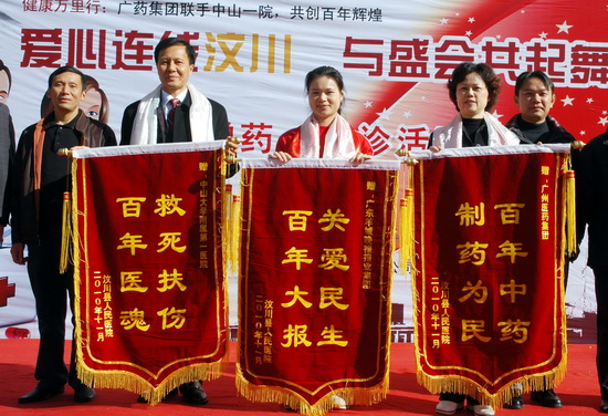 据了解,汶川县在512地震中受灾人口达13万人,县内大部分医疗公共设施被毁。在广东人民的援助下,经过两年多的努力,如今汶川的复建工作已初显成效,汶川人民医院硬件设施完善,但医疗资源、医护水平等软件条件仍有待提高。汶川政协、卫生局领导及汶川人民医院院长表示,此次送医赠药活动为汶川医院带来及时的支持和帮助,广药集团、中山一院以及羊城晚报的深情厚爱和博爱精神充满了人道主义关怀,必会带来巨大的社会效益。汶川人民医院向爱心队伍回赠了锦旗,以表谢意。