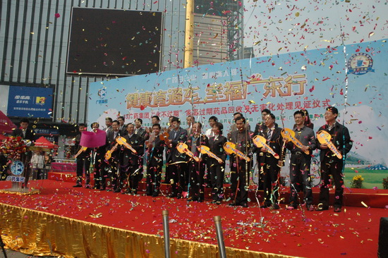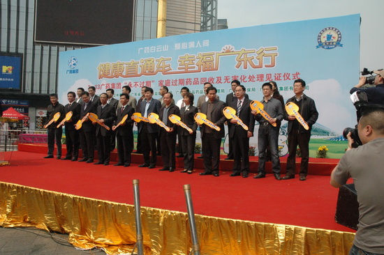 活动当天,先后举行了2010年“永不过期药店”、“永不过期社区医疗点”服务评比优胜单位表彰仪式、回收废旧药品现场封存仪式、医药专家和现场市民共同见证过期药品无害化处理仪式、广药集团——百强连锁“永不过期”金牌服务联盟启动仪式、“永不过期”健康直通车发车仪式,活动仪式结束后,一辆辆健康直通车满载着广药人对广大消费者的无限厚爱奔赴南粤大地,去到城镇、去到乡村、去到千家万户老百姓的家里,开展家庭过期药品回收服务。