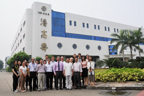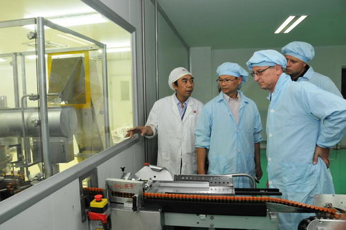魏大华董事长向师生团介绍了潘高寿的情况。同时,施马尔格教授也就耶拿市科技、经贸、文化特色一一作了介绍。客人们还观看公司宣传片,饶有兴趣地服用蛇胆川贝液等产品,随后参观了车间。