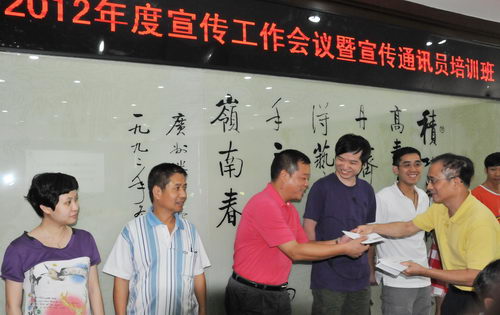 宣传工作会由党办副主任李雪文主持,首先由《潘高寿》执行主编刘泽恩小结公司宣传工作阶段性成绩以及办报的经验。随后,公司领导和党办主任何凤娟,周丽华会长分别向公司去年的优秀宣传工作者、优秀通讯员、积极通讯员以及广州地区企业报“好新闻”奖获得者颁奖。我司去年在广州地区企业报“好新闻”评选中,共有包括消息、通讯、言论、照片等10件新闻作品获奖。难能可贵。