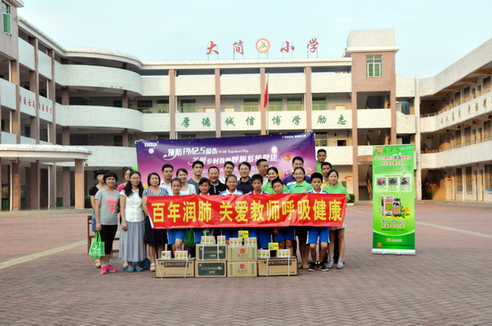 9月11日,以“积功累德,济人济世”为祖训、专注于中医药养肺护肺的白云山潘高寿药业在“广药潘高寿绿肺基金”支持下,组织绿肺基金的志愿者和广州市南沙区东涌镇社区卫生服务中心的医务人员来到东涌镇大简村的大简小学,举办以“预防PM2.5损伤,关爱乡村教师呼吸系统健康”为主题的教师节感恩公益活动,深入社会最基层,为这里的老师们进行包括呼吸系统等健康检查,并为他们送上潘高寿蜜炼川贝枇杷膏、防霾润喉糖等产品的养肺礼包,希望潘高寿的护肺产品能成为园丁们的“护肺盾牌”。同时,潘高寿传统中药文化第五代传承人、白云山潘高寿药业公司副总经理卢其福,通过健康知识讲座向学校师生普及绿色防霾理念和中医药护肺养生知识,并为园丁们提供日常养肺建议:“教师在环境压力和精神压力之下,容易伤神伤肺,应更注意护肺养生。常用温开水、川贝枇杷糖润喉;少食辣椒等刺激性较强的食物,多摄取一些清肺养阴、化痰散结的食物,日常可服用潘高寿枇杷膏等护肺护嗓。”