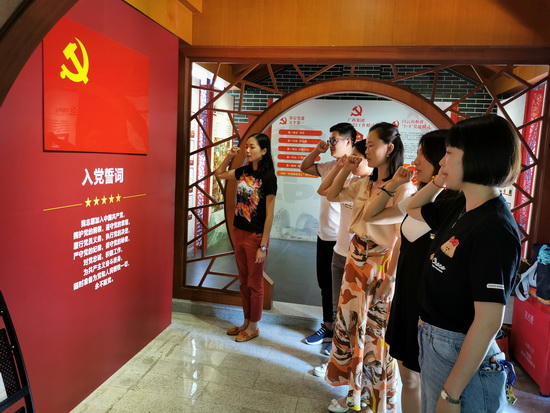 参观学习前,党支部委员伍诗韵、王少娜带领全体党员重温了入党誓词,全体党员精神抖擞,面向党旗和入党誓词,庄严宣誓,提醒每一位党员要不忘初心,牢记使命!时刻保持共产党员的责任感和使命感,为打造世界一流企业拼搏奋斗!